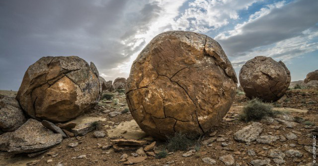 Další možnost vysvětlení tajemství kamenných koulí vás možná napadne při procházce „Údolím koulí“ na náhorní plošině Usťurt v Kazachstánu (44.3227033N, 51.5993836E), kde se nacházejí tisíce a tisíce takovýchto podivných kamenných útvarů: